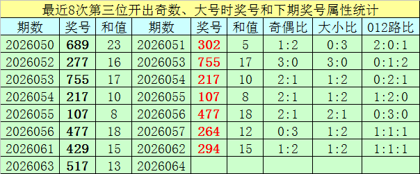 在其下期开奖中,分别开出号码:302、755、217、107、477、264、294,其中号码奇偶总比例为11:10,奇偶号码走势相当;