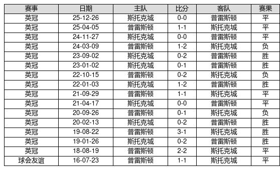 普雷斯顿 VS 斯托克城两队近10年的交战次数为16场,普雷斯顿6胜7平3负,赢球概率为37.5%,平局概率为43.8%,输球概率为18.8%。