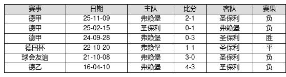 圣保利 VS 弗赖堡两队近10年的交战次数为6场,圣保利1胜1平4负,赢球概率为16.7%,平局概率为16.7%,输球概率为66.7%。