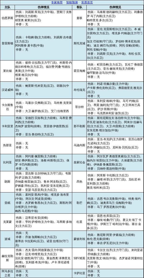 组成。英超赛场,曼联2名主力后卫伤缺;英冠赛场,斯托克城遭遇严重伤病潮;意甲赛场,卡利亚里主力后卫停赛;热那亚阵容齐整;西甲赛场,皇家社会伤3主力。