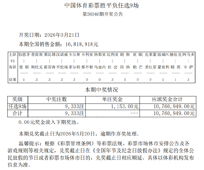 北京时间3月21日,足彩第26046期任九开奖结果揭晓。本期任选九场开出9333注,单注奖金1153元。本期任九投注总额为16,818,918元。