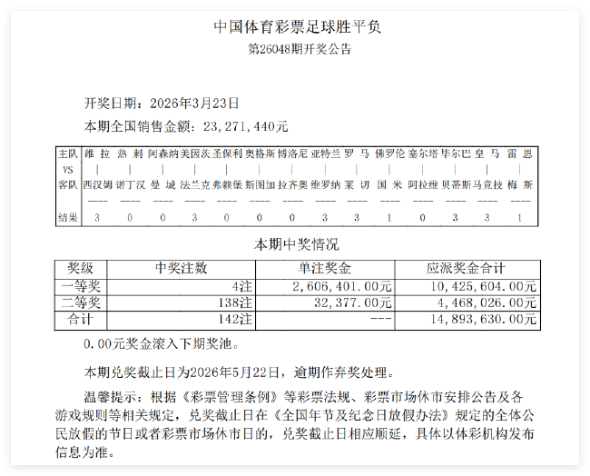 北京时间3月23日,胜负彩第26048期开奖结果揭晓。14场1等开出4注,单注奖金260万;14场2等开出138注,单注奖金32377元。任九开出1036注,单注奖金13672元。本期足彩销量为23,271,440元,任九投注总额为22,131,804元。