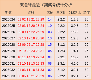 双色球最近10期奖号和数据分析表