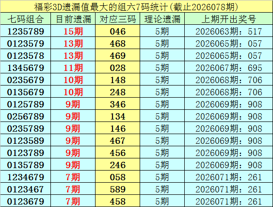 福彩3D七码遗漏组六分析(第2002001期-第2026078期)