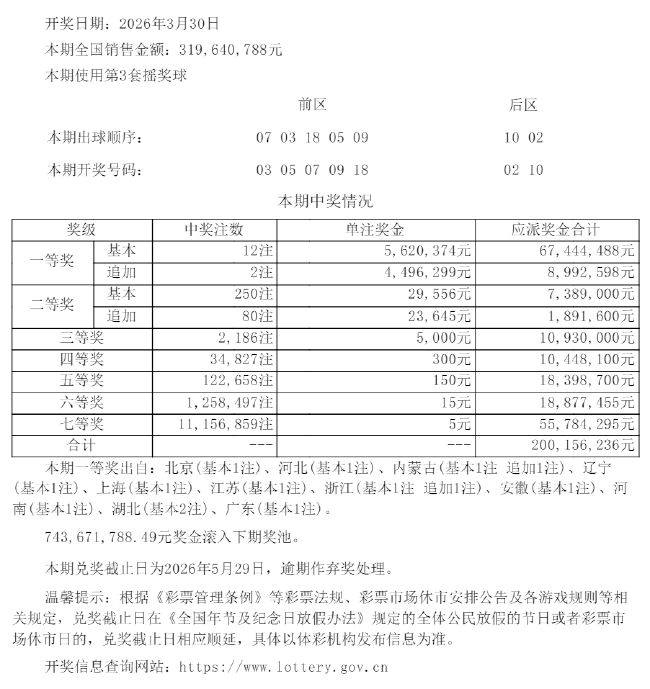 本期全国共开出12注一等奖,单注奖金562万余元,其中2注选择追加,每注多得奖金449万余元,2注追加头奖分落内蒙古、浙江。10注基本头奖分落9地,其中湖北中出2注,北京、河北、辽宁、上海、江苏、安徽、河南、广东各1注。二等奖开出250注,单注奖金2.9万余元,其中80注采用追加投注,每注多得奖金2.3万余元。本期全国销量为3.19亿元,开奖后奖池余额7.43亿,根据大乐透新规,下期固定奖奖金将按8亿以下对照。
