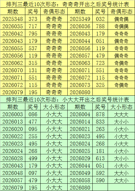 排列三最近10次同时开出奇偶形态:奇奇奇和大小形态:小大大时其奖号分别为:395-355-155-159-179-155-177-397-375-179-195,下期分别开出号码为:436-243-918-346-743-267-221-143-539-051,详细统计见下表:
