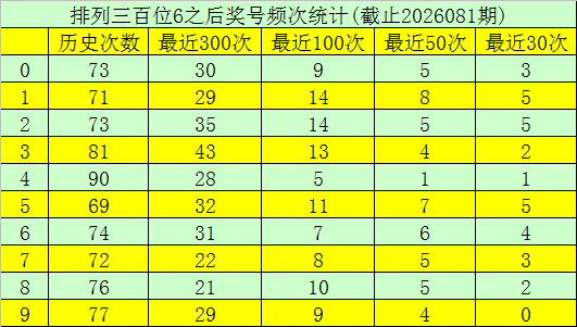 第一位杀号:上期第一位奖号为6,第一位奖号6历史上出现757次,前100次该位开出奖号6之后,下期号码0-9出现次数从高到底分别为:号码2、1→14次,3→13次,5→11次,8→10次,0、9→9次,7→8次,6→7次,4→5次。