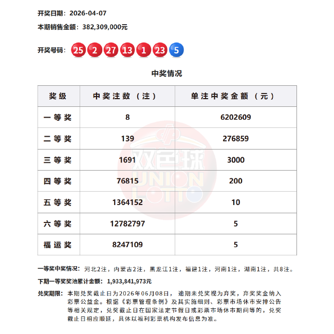 北京时间2026年4月7日,福彩双色球第26038期开奖,当期开奖号码为红球01 02 13 23 25 27,蓝球05。本期一等奖开出8注,单注奖金620万余元;二等奖开139注,单注奖金27万余元。此外,因开奖前奖池高于15亿,增设5元福运奖(命中3枚红球即中奖),共开出8247109注。本期双色球全国销量为3.82亿余元,计奖结束后奖池余额为19.33亿余元。