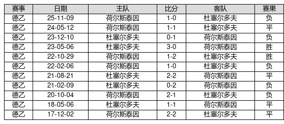 杜塞尔多夫 VS 荷尔斯泰因两队近10年的交战次数为11场,杜塞尔多夫2胜4平5负,赢球概率为18.2%,平局概率为36.4%,输球概率为45.5%。