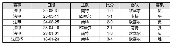 欧塞尔 VS 南特两队近10年的交战次数为6场,欧塞尔2胜1平3负,赢球概率为33.3%,平局概率为16.7%,输球概率为50.0%。