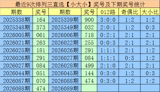 1.排列三第2026088期奖号开出474,大小直选分布为:小大小,在历史开奖中直选【小大小】分布已开出950期,在前9次直选【小大小】分布中,出现奖号为:164-373-061-263-181-291-084-051-070,组三开出3期,组六开出6期。