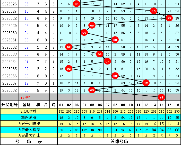 蓝球走势分析:上周四第26036期蓝球开出号码08,最近十周星期四蓝球号码大小比为4:6,奇偶比为4:6,012路比为2:6:2。本期蓝球重点关注偶数号,看好蓝球04、14。