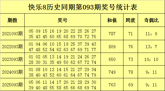 奇偶比分析:去年第093期奖号奇偶比为9:11,历史同期第093期奖号奇偶总比例为52:48,奇数号码表现较热,今年第093期看好奇数号码表现较热,参考奇偶比13:7。
