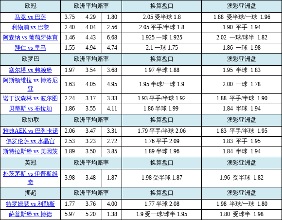 胜负彩26060期欧亚赔率对照:欧冠多队盘口存差异