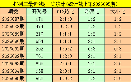 一、排列三第2026095期开出号码568,其奇偶比为1:2,大小比为3:0,号码012路比为1:0:2。该号码直选历史上出现了11次。