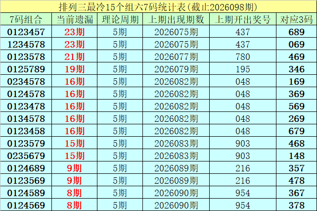 (1)在排列三已开出的7573期奖号中(统计截止第2026098期),目前7码组六遗漏值最大的组合为:0123457、1234578,本期遗漏23期;