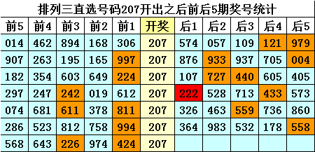 四、排列三直选号码207历史上开出7次,其前后五期奖号分别为:
