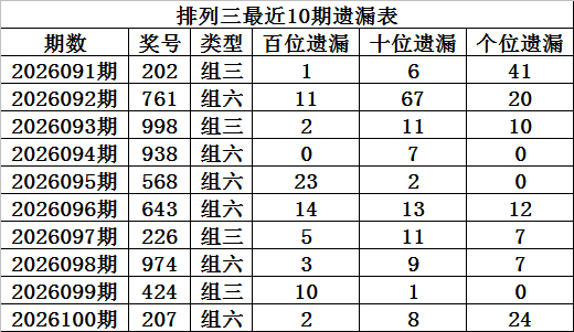 上期回顾:排列三第2026100期奖号:207,组六,直选遗漏总值为34期。