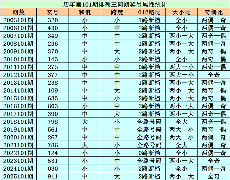 历史上第2026101期排列三已开出21期奖号了,历年同期奖号分别为:320、430、349、236、370、143、275、377、238、109、633、603、390、798、561、267、786、124、531、030、911,详细统计见下表: