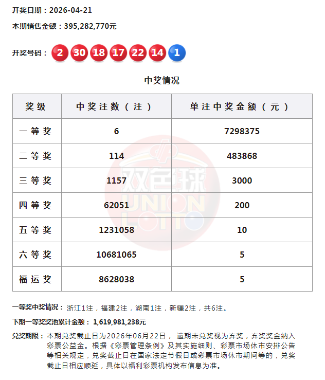 北京时间2026年4月21日,福彩双色球第26044期开奖,当期开奖号码为红球02 14 17 18 22 30,蓝球01。本期一等奖开出6注,单注奖金729万余元。二等奖开出114注,单注奖金48万余元。此外,因开奖前奖池高于15亿,增设5元福运奖(命中3枚红球即中奖),共开出8628038注。本期双色球全国销量为3.95亿余元,计奖结束后奖池余额为16.19亿余元。