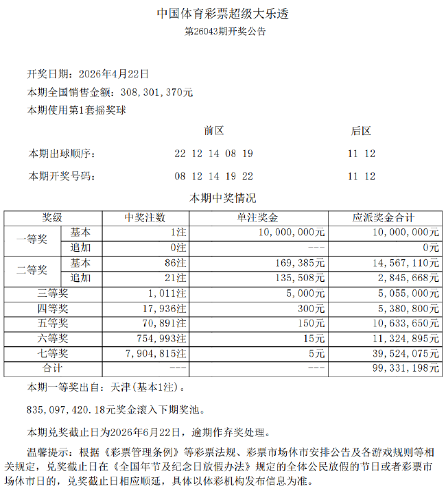 北京时间4月22日晚,体彩大乐透第26043期开奖,当期开奖号码为前区08 12 14 19 22,后区11 12。