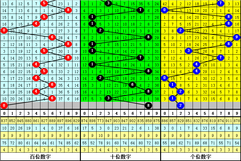 百位分析:最近50期表现较热的号码有:4出现9次,5、8出现8次;表现较冷的号码有:3出现1次,1、7出现2次。出号奇偶比为19:31,012路比为16:13:21。本期该位绝杀两码6、8,参考号码0、4、5,精选一码0。