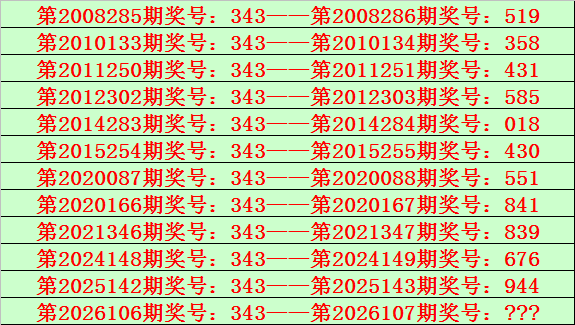 排列三第2026106期开出奖号343,该号码直选类型历史上出现了12次,前11次开出之后期下期奖号为:519、358、431、585、018、430、551、841、839、676、944,见下表: