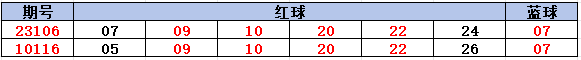 从上图清晰可见,23106期与10116期的开奖号码只有龙头和凤尾两个号码不同,中间四个红球和蓝球都是相同的。不光如此,这2组号码的和值、三区比和奇偶比都完全一致,虽然6个号码中有2个不同,但是和值加起来都是92,实在是神奇!