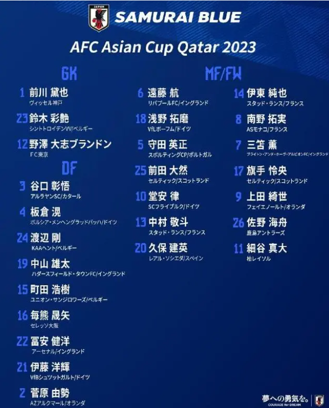 日本队亚洲杯26人球员名单: