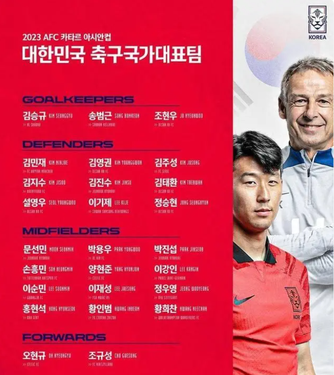 近日,韩国队正式公布了参加卡塔尔亚洲杯足球赛的26人大名单,孙兴慜、李刚仁、金玟哉悉数入选。具体名单如下: