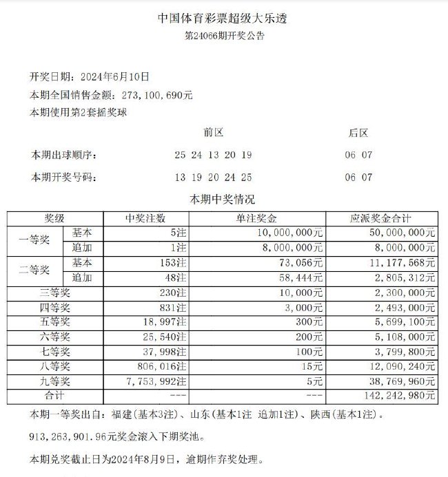 北京时间6月10日晚,体彩大乐透第24066期开奖,当期开奖号码为:前区13 19 20 24 25+后区06 07。