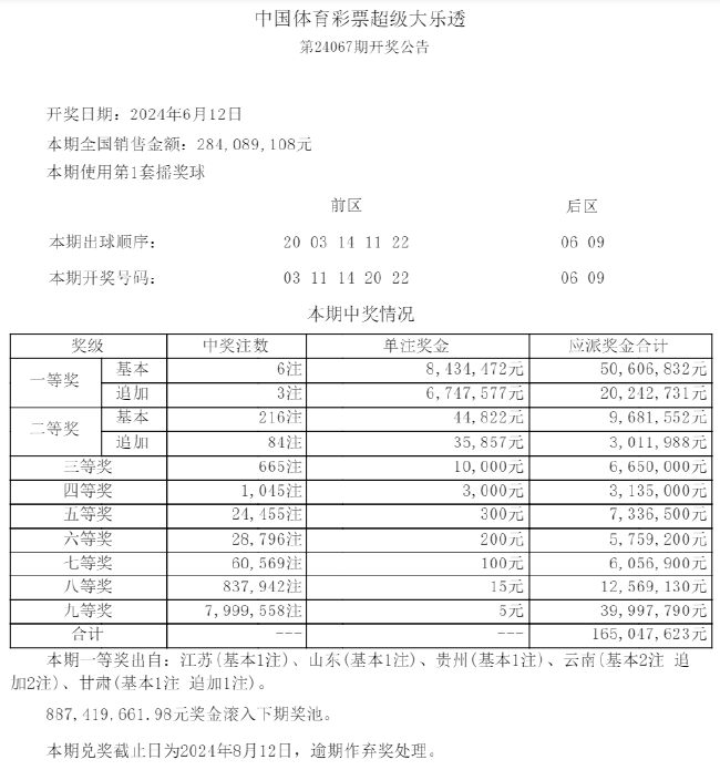 二等奖开出216注,单注奖金4.4万余元;其中84注采用追加投注,每注多得奖金3.5万余元。本期大乐透全国销量为2.84亿元,奖池方面,8.87亿余元滚存至6月15日(周六)开奖的第24068期。
