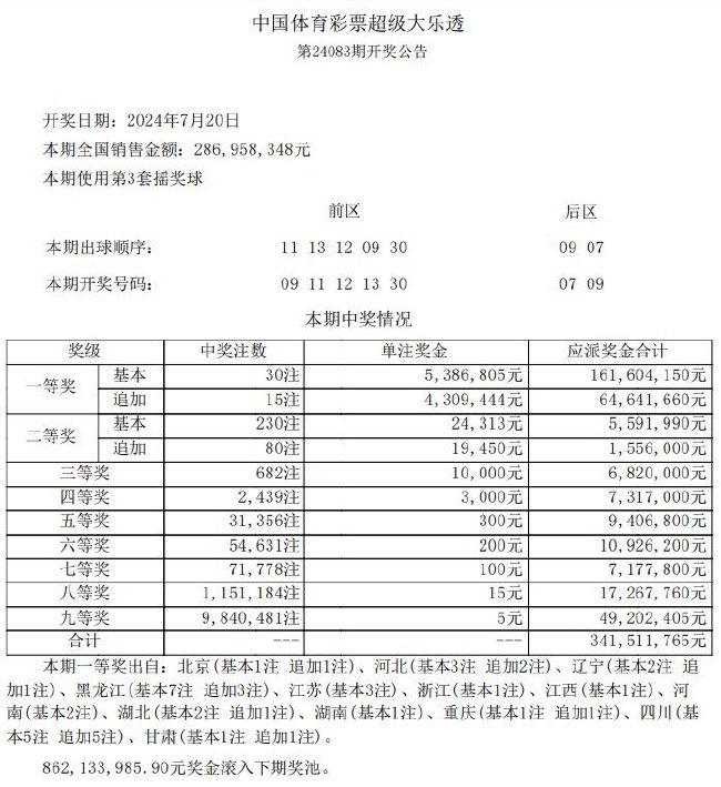 二等奖开出230注,单注奖金2.4万余元,其中80注采用追加投注,每注多得奖金1.9万余元。本期大乐透全国销量为2.86亿元,奖池方面,8.6亿余元滚存至7月22日(周一)开奖的第24084期。
