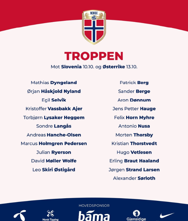 中前场:桑德-贝格(富勒姆)、帕特里克-贝格(博德闪耀)、多努姆(图卢兹)、海于格(博德闪耀)、菲利克斯-米勒(布兰)、努萨(莱比锡)、托斯比(热那亚)、索尔茨维特(萨索洛)、维特勒森(布鲁日)、哈兰德(曼城)、拉森(狼队)、瑟洛特(马竞)