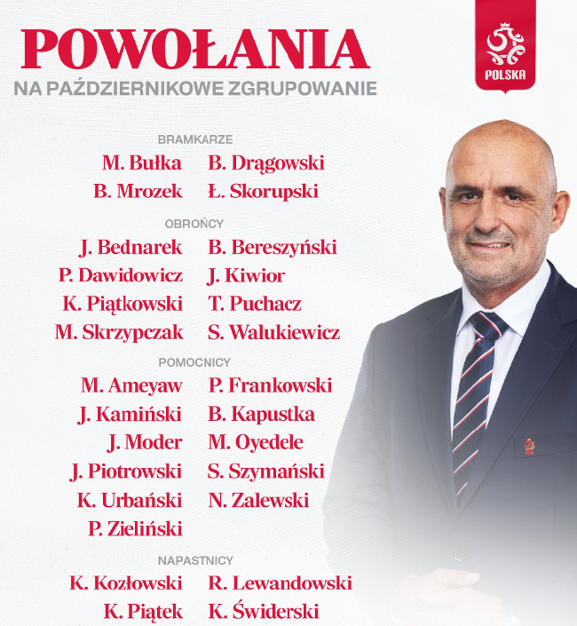 当地时间9月30日,波兰主帅普罗别日公布了参加欧洲国家联赛的27人名单。莱万多夫斯基、泽林斯基领衔,三名新人入选。