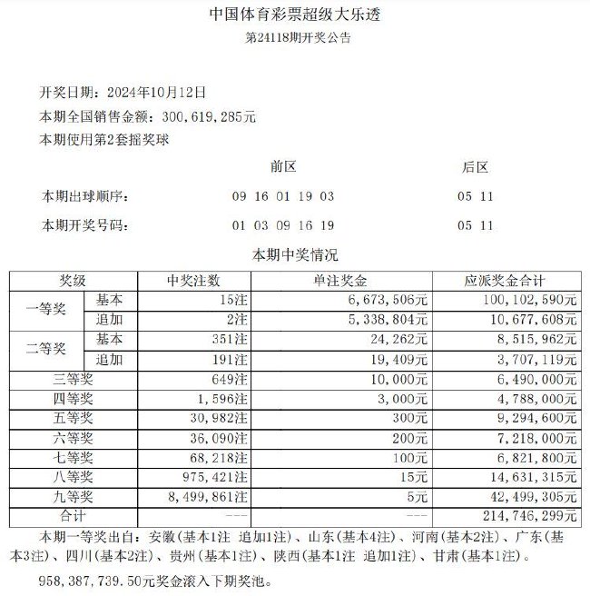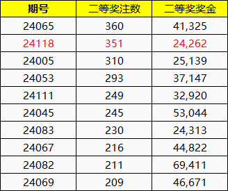 北京时间10月12日晚,体彩大乐透第24118期开奖,当期开奖号码为前区01 03 09 16 19,后区05 11。本期大乐透二等奖迎来井喷,爆出351注二等奖,位列年度第二!单注奖金24262元,为今年最低二等奖。