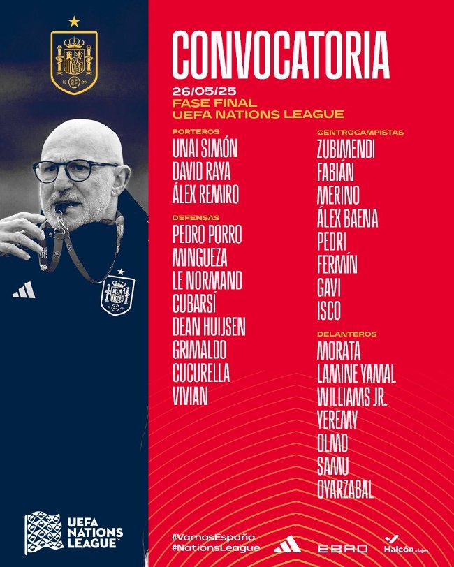 北京时间5月26日,西班牙队公布了新一期的大名单,亚马尔领衔,刚刚转会皇马的赫伊森和新科欧冠冠军法比安-鲁伊斯在列,费兰-托雷斯因伤缺席。