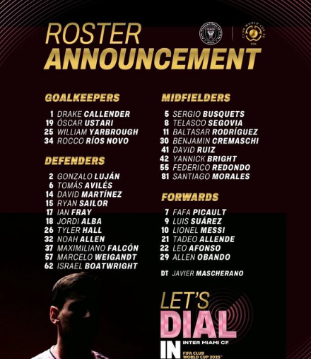 迈阿密国际公布了他们参加即将举行的世俱杯的大名单,梅西、阿尔巴、布斯克茨、苏亚雷斯领衔。