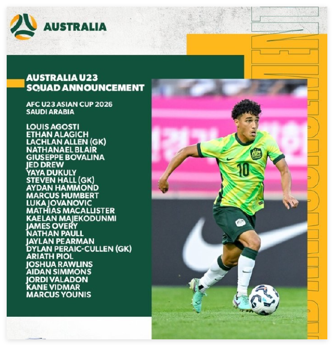 12月29日,澳大利亚U23公布了本次U23亚洲杯的大名单,身价最高的为来自奥超的杰德-德鲁,阿德莱德联有三人入选。